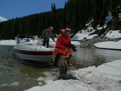 Cameron, a successful ski instructor from Utah, promised a "Deer Valley experience" and he did not dissapoint. On June 4th, we climbed aboard "No Worries", a 20' speedboat Captained by Frederick Howard. "No Worries" allowed us to circumvent an arduous canoe trip across the lake. On the western edge of the lake, Cameron donned waders to ferry the gear and guides to the icy shore. Cameron was proving to be very "guidable."