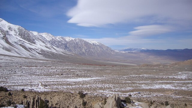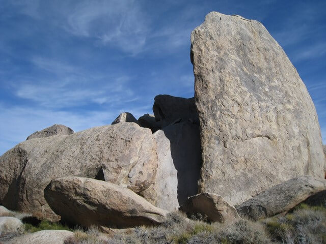 View of the Eastern Sierras through a boulder pile at the Druid Stones